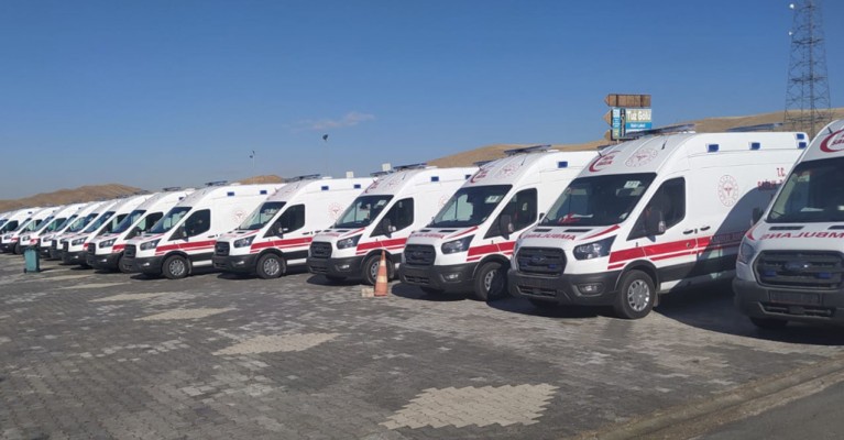Şanlıurfa'ya 38 tam donanımlı ambulans, 3 yeni doğan donaımlı ambulans olmak üzere 41, Gaziantep'e 35, Hatay'a 35 ambulans tahsis edildiği öğrenildi.