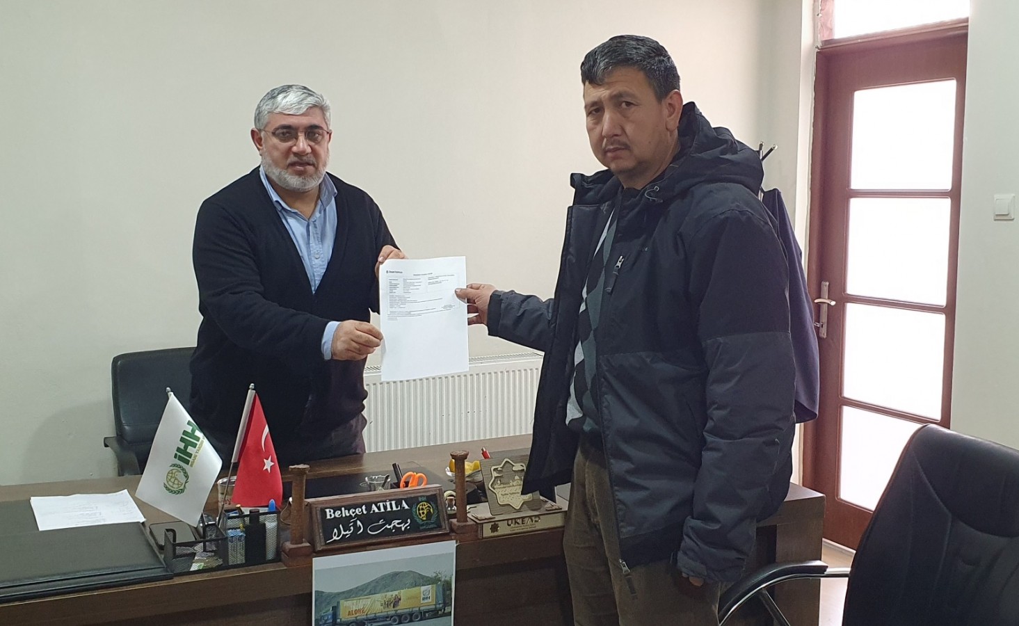 Afgan mahalle sakinlerini temsilen Şanlıurfa Türkistanlılar Kültür ve Eğitim Derneği Başkanı Seyfettin Bora ve Afgan Mahallesi Muhtarı Sefer Muhammed Erdem, topladıkları 11 bin TL ile bir miktar giysiyi Şanlıurfa İHH Şubesi'ne teslim etti.