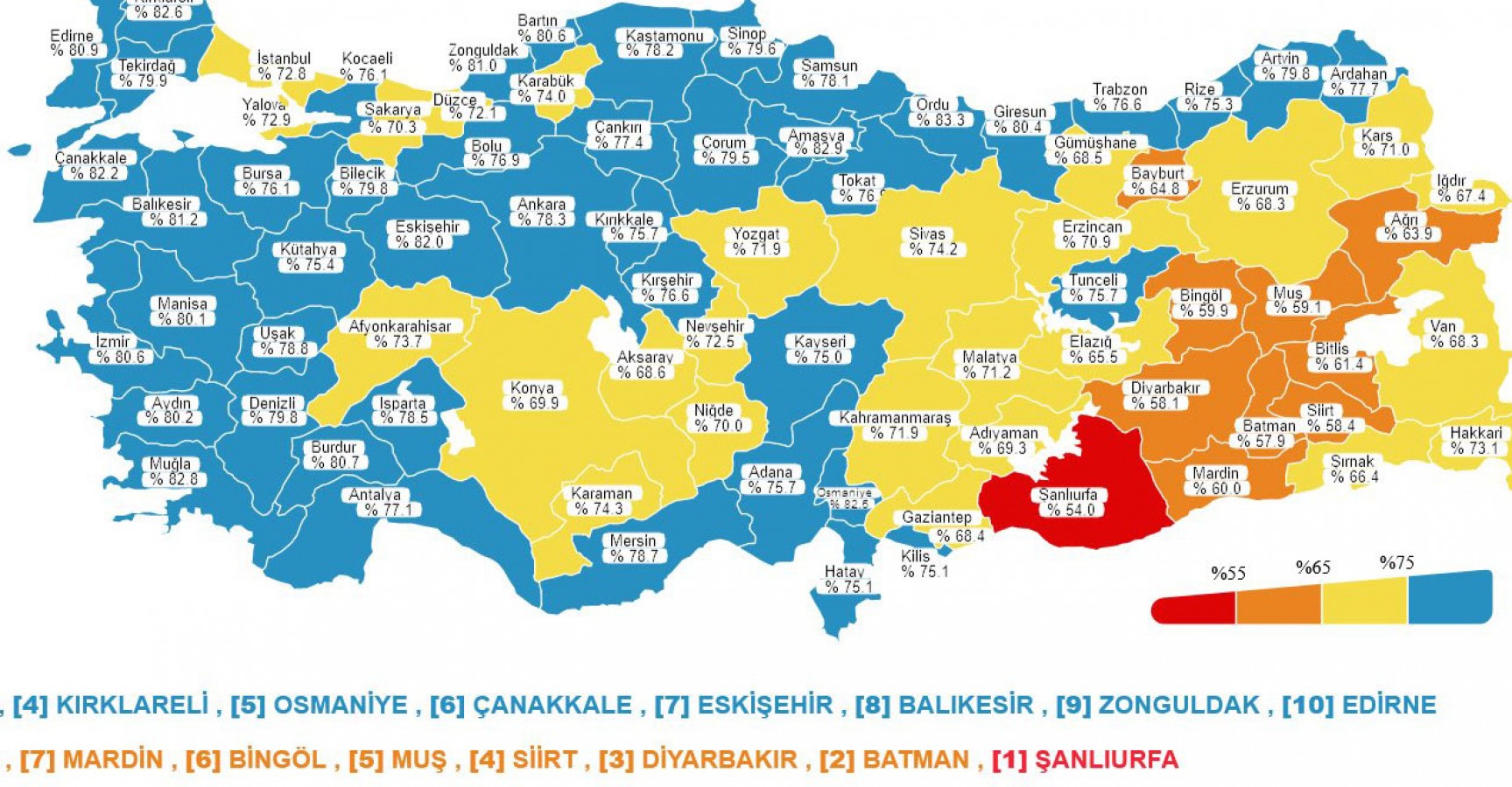 Şanlıurfa aşılama oranındaki düşük veri ile haritada hala kırmızı renkteki tek il. Ancak kentin turuncu renge geçmesi için yüzde 55 oranına yükselmesi gerekiyor. Kentin aşılamada şuan ki oranı ise yüzde 54.