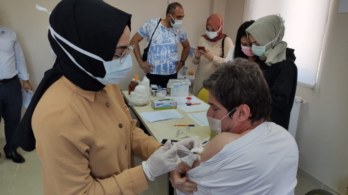 Şanlıurfa OSB Sağlık Ocağında yapılan Kovıd- 19 aşılarına ilk günden yoğun talep oldu. İlk gün Şanlıurfa OSB Müdürlük Personeli, Harran Üniversitesi MYO Hocaları ve birçok sanayici aşı oldu. Yerinde ve hızlı aşılamayı daha da hızlandırmak için bugün yeniden Şanlıurfa OSB Müdürlüğü ve Halk Sağlığı Müdürlüğü koordine olarak aşı ekibini 5’e, aşılanma saatini de 10.00’dan 20.00’ye çıkarıldı.
