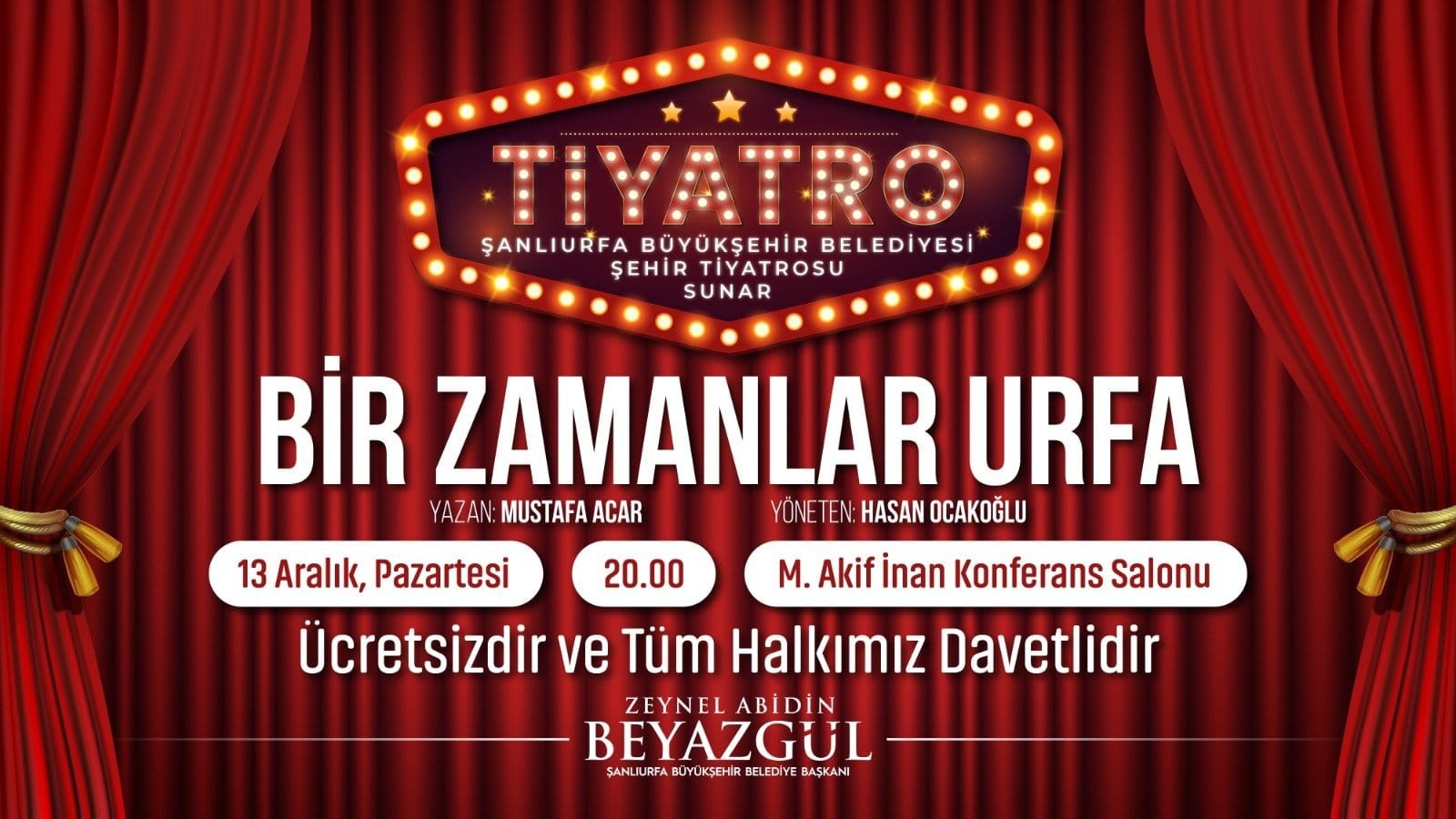 Mustafa Acar’ın yazdığı, Genel Sanat Yönetmenliğini Hasan Ocakoğlu’nun yaptığı ‘’Bir Zamanlar Urfa’’ adlı tiyatro oyunu, 13 Aralık Pazartesi günü Saat 20.00’da Mehmet Akif İnan Konferans Salonu’nda sahnelenecek.