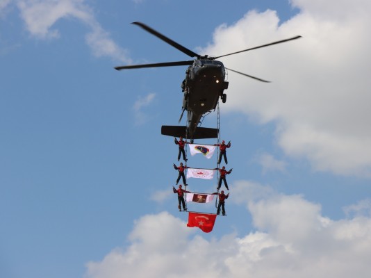 SOLOTÜRK gösterisinin Jandarma ekipleri helikopterle Şanlıurfa Eski Havaalanına gelerek “Üzüm Salkımı” gösterisi yaptı. Gösterilerin sonunda vatandaşlar SOLOTÜRK Ve ‘Üzüm Salkımı’ gösterisini gerçekleştiren jandarma ekiplerini uzun süre alkışladı.