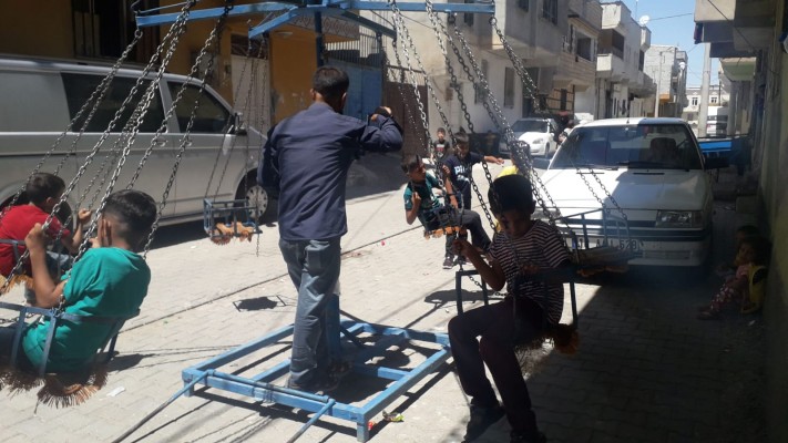 Hayati Harrani Mahallesinde sokağa çıkan çocuklar, özellikle geçmiş yıllarda büyük bir eğlence aracı olan ve bölgeden geçen seyyar salıncağa binerek vakit geçirdi.