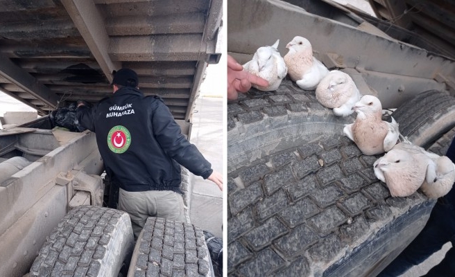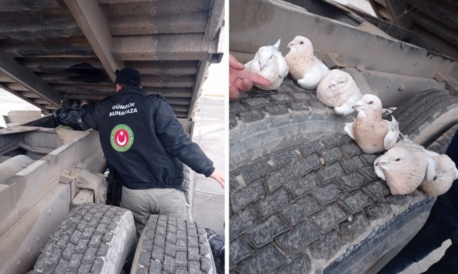 Suriye'den Türkiye'ye girmek üzere Akçakale Gümrük Kapısı'na gelen bir kamyon, riskli olarak değerlendirilerek X-ray taramasından geçirildi. İncelemede kamyonun alt kısmında özel bir bölme olduğunu tespit eden gümrük muhafaza ekipleri detaylı arama yaptı. Aramada, damperin alt kısmında özel bölmeye gizlenmiş 6 adet güvercin ele geçirildi.