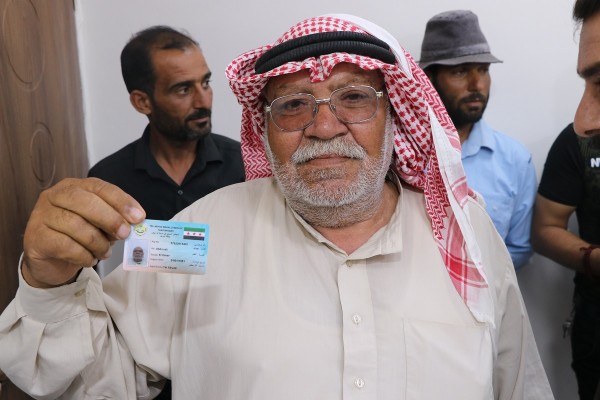 Şanlıurfa Valiliği Suriye Destek ve Koordinasyon Merkezi (SUDKOM) tarafından hizmet vereceği binası onarılan ve tefriş edilen Telabyad Nüfus Müdürlüğüne yeni kimlik kartlarını almak için başvuranlar, kayıtlarının tamamlanmasının ardından birkaç dakika içinde yeni kimliklerine kavuşuyor.