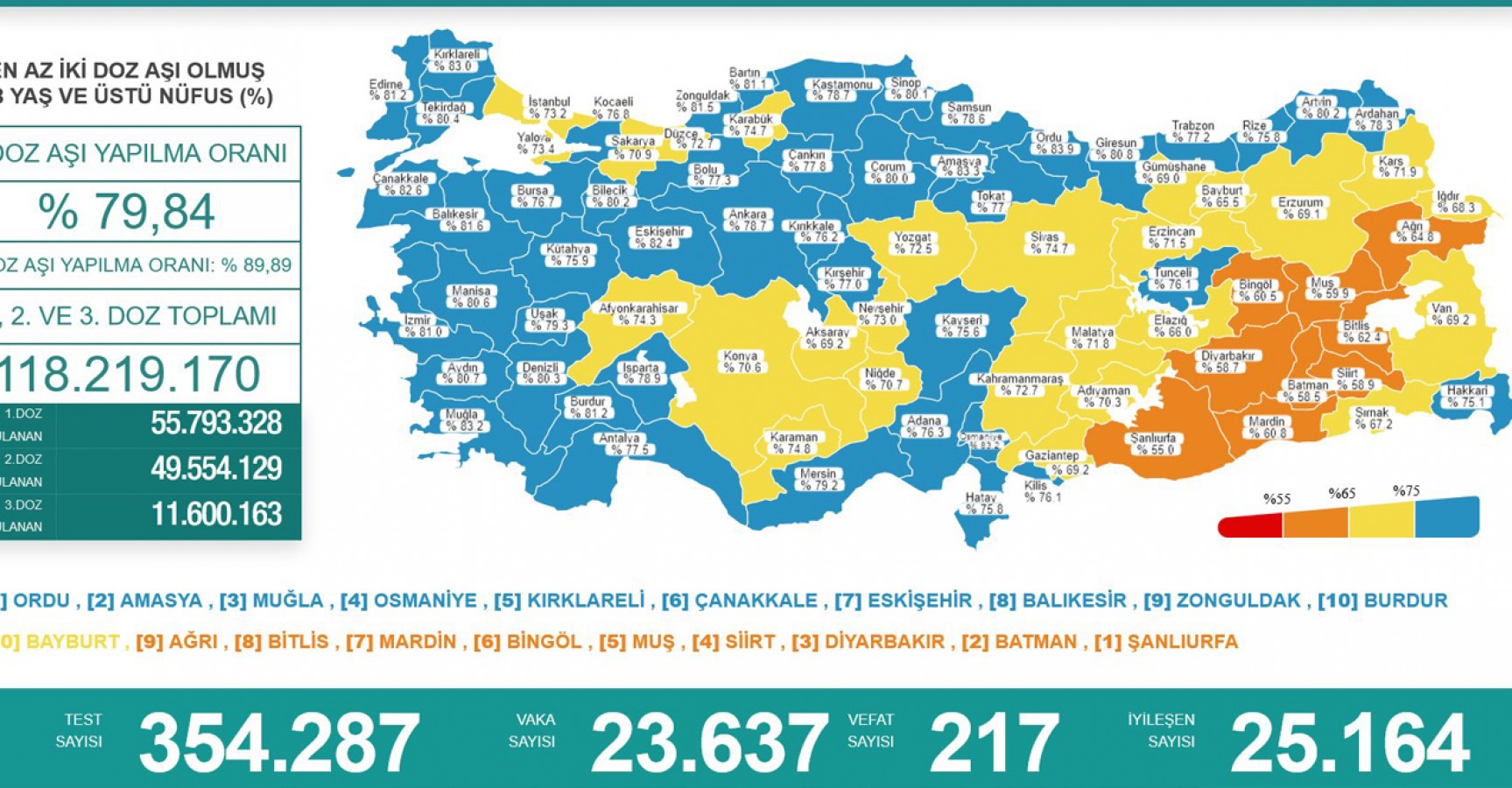Aşılama oranında ise Şanlıurfa'yı ilgilendiren bir değişim olduğu görüldü. Türkiye'de bugüne kadar uygulanan aşı miktarı 118 milyon 219 bin 170 doza yükselirken haritada aşılama oranındaki düşük rakam nedeniyle kırmızı ile gösterilen Şanlıurfa aşılamada yüzde 55'e ulaştığı için turuncu renkte gösterilmeye başlandı. Ancak sıralaması yine değişmedi. En az iki doz aşı uygulananların oranının en düşük olduğu illerin başında Şanlıurfa yer buldu. Şanlıurfa'yı sırasıyla Batman, Diyarbakır, Siirt, Muş, Bingöl, Mardin, Bitlis, Ağrı ve Bayburt izledi.