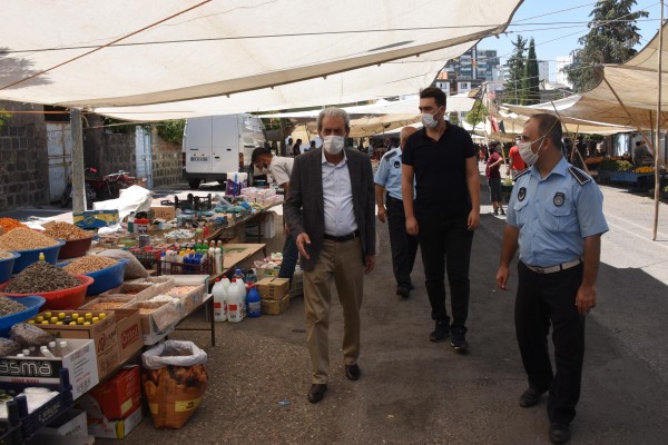 Pazar esnafını ziyaret eden Aydın, esnafa, müşteriler ile aralarında sosyal mesafeye dikkat etmeleri ve mutlaka maske takmaları gerektiğini belirterek uyarılarda bulundu.