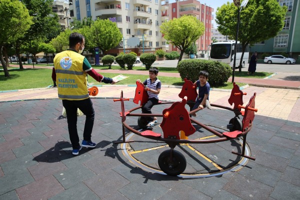 İçişleri Bakanlığı Genelgesi ve Cumhurbaşkanı Recep Tayyip Erdoğan'ın açıklamaları ile 0-14 yaş arası çocukların, sokağa çıkma kısıtlamasının saat 11.00 ile 15.00 arası esnetilmesi sonrası parklara akın eden çocuklar Haliliye Belediyesi tarafından unutulmadı.