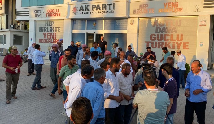Şanlıurfa’da suları kesildiği için ekinleri kuruyan çiftçiler, suların bırakılması için AK Parti Şanlıurfa İl Binası önünde toplandı. Sorunun çözüme kavuşması için yetkililere çağrıda bulunan çiftçiler su kesintilerinin son bulmasını istediler.