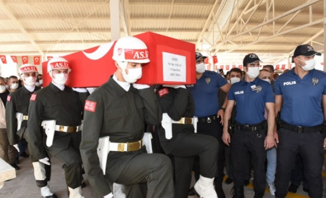 Suriye'nin İdlib kentindeki terörist saldırısı sonucu şehit olan, Şanlıurfa Bozova nüfusuna kayıtlı Piyade Uzman Onbaşı Serdar Aslan'ın cenazesi, Gaziantep'te düzenlenen törenin ardından toprağa verildi.