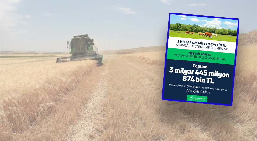 “2 milyar 479 milyon TL tarımsal destekleme ödemesi ve 966 milyon TL yaş çay alım bedeli olmak üzere; toplam 3 milyar 445 milyon 874 bin TL ödemeyi bugün çiftçilerimizin hesaplarına aktarıyoruz. Bereketli olsun. Tüm üreticilerimize ve vatandaşlarımıza hayırlı bayramlar diliyorum”.
