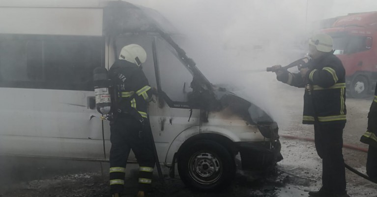 Öğleden sonra Akçakale çevre yolu üzerindeki Öz Harran Tır Garajında meydana gelen olayda, 47 AF 885 plakalı minibüs yanmaya başladı.
