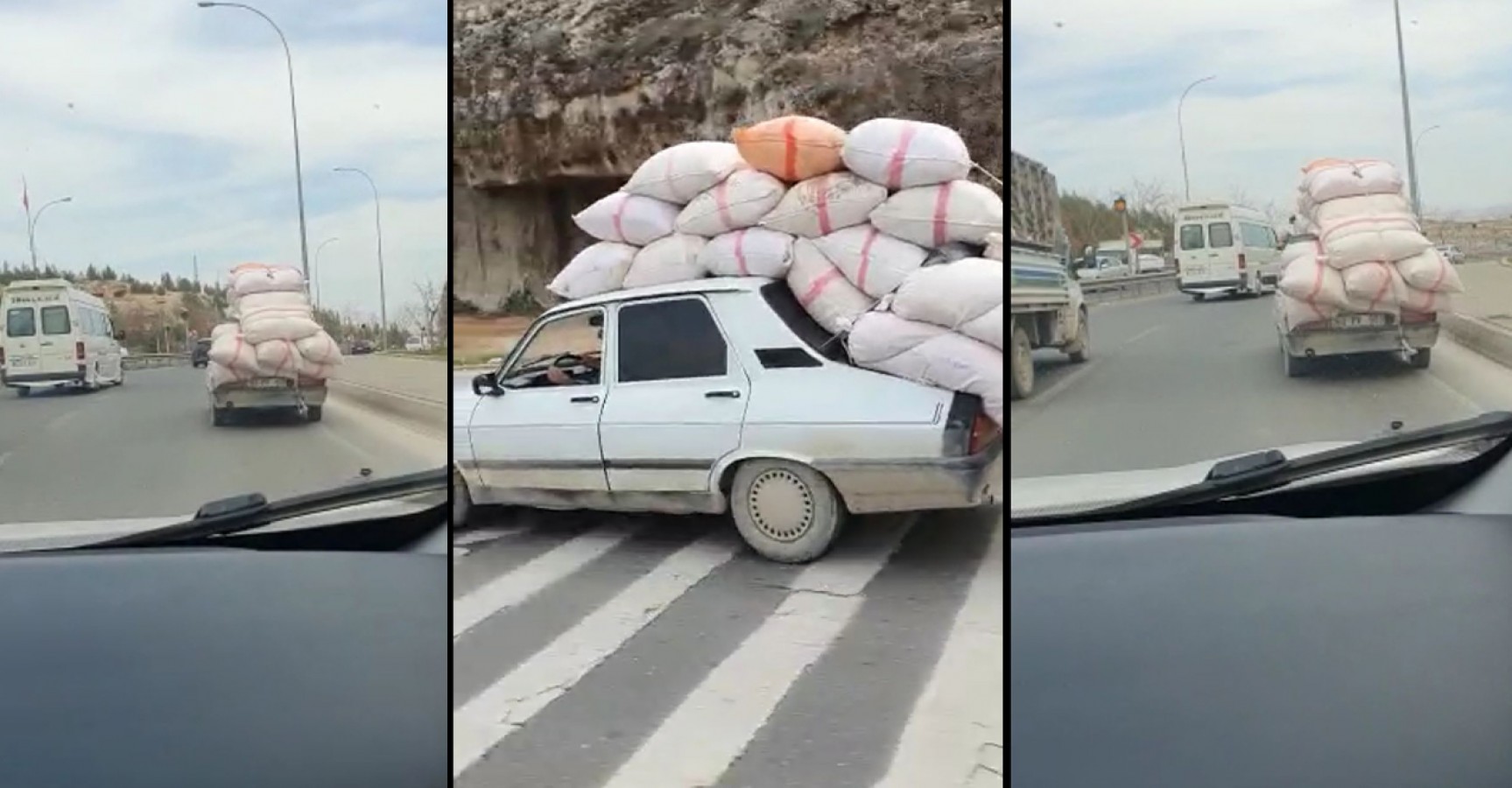 Şanlıurfa’da Toros model aracının bagajına ve üzerine yüklediği çuvallarla trafikte tehlikeli şekilde seyreden sürücü 'pes artık' dedirtti.