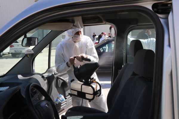 Şanlıurfa Fuar Merkezinde kurulan istasyona gelen vatandaşlar, araçlarını Büyükşehir Belediyesi'nin uzman personellerine teslim ederek dezenfekte işlemlerini izliyor. Dezenfekte solüsyonu içeren ve ince püskürtme tekniği kullanan ULV cihazıyla uygulamasını yapan Büyükşehir ekipleri, tüm detayları gözden geçirerek çalışmasını sürdürüyor.