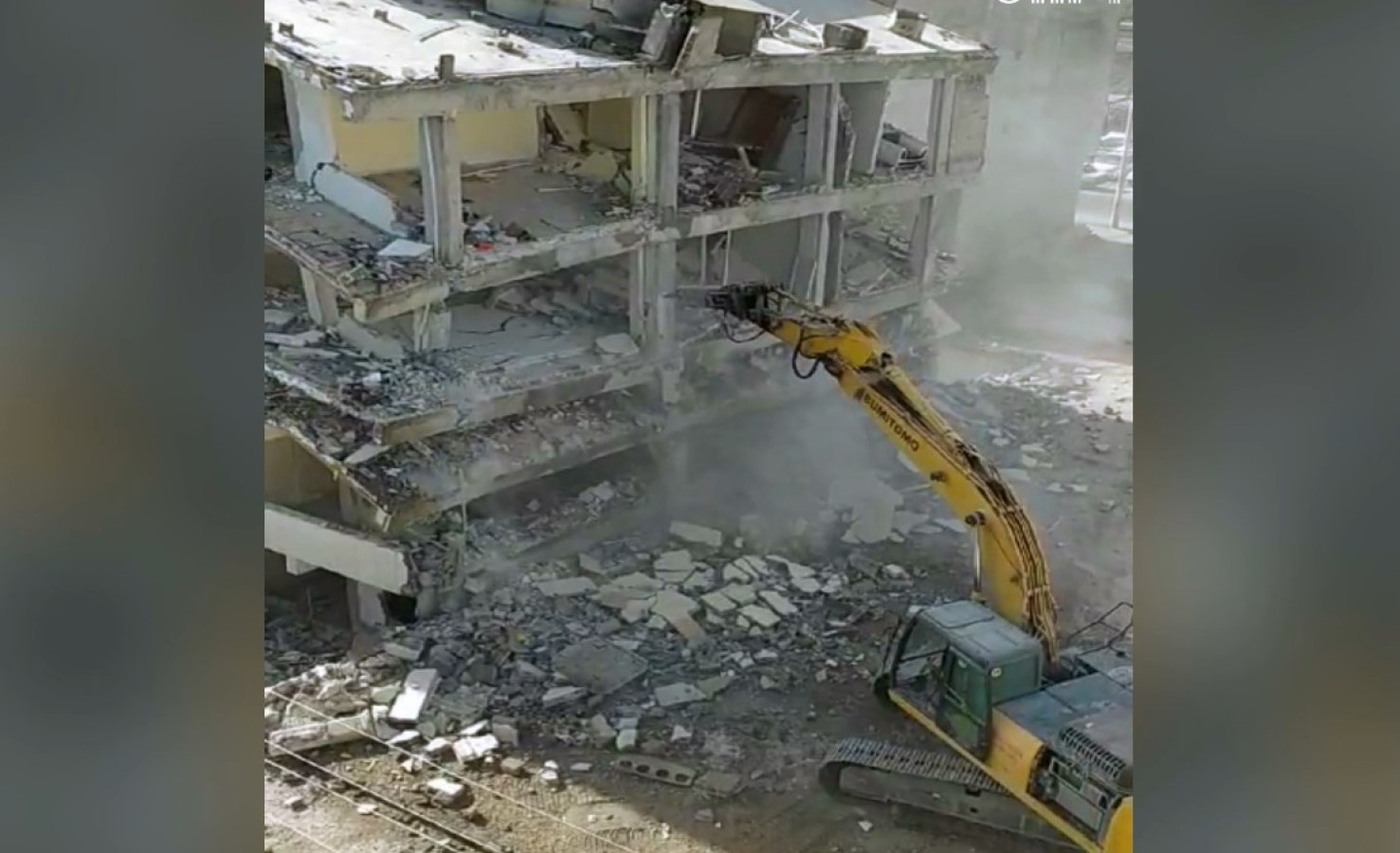 Haliliye’de, depremde ağır hasar gören 5 katlı bir bina kontrollü şekilde yıkıldı.