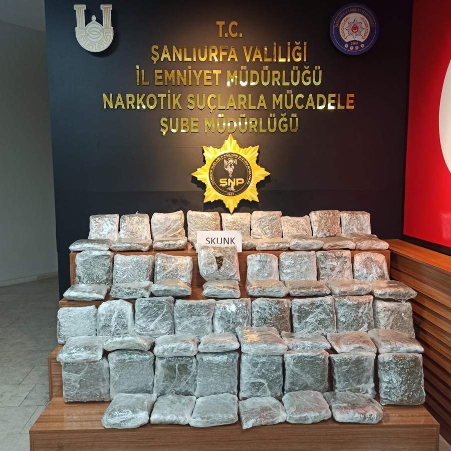 yapılan aramada 67 paket halinde 38 kilo 100 gram kimyasal uyuşturucu (skunk)
