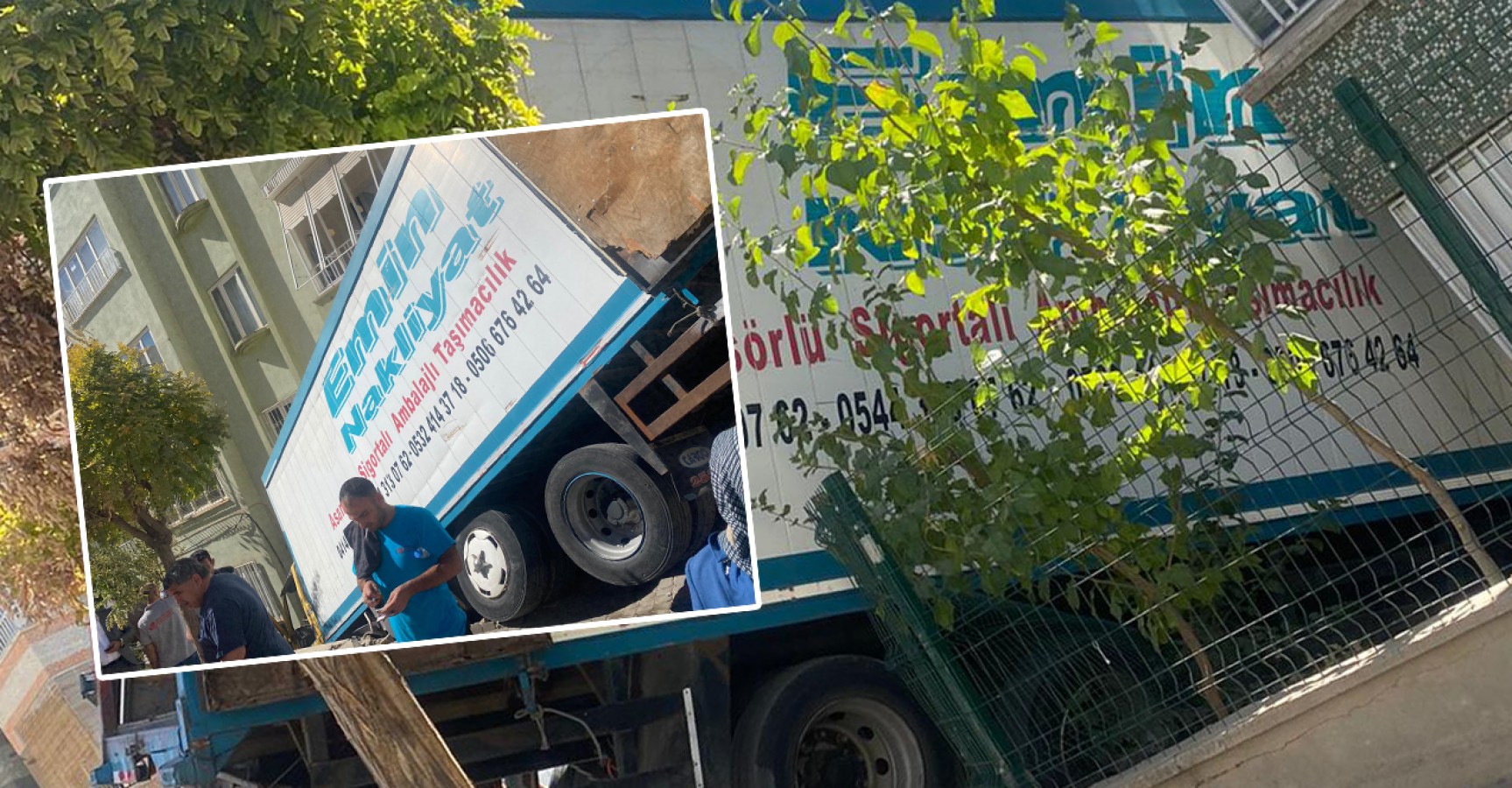 Gürültüyle camlara koşan bina sakinleriyse binaya çarpan kamyonu görünce şaşkınlık yaşadı.