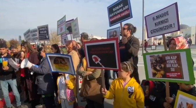 “Sokak hayvanları sahipsiz değildir”, “6. madde kırmızı çizgimizdir”, “Bir kap bir yemek su” yazılı dövizler açan hayvan hakları savunucuları adına Kimsesiz Hayvanları ve Doğayı Koruma Derneği Temsilcisi Yasemin Al basın açıklamasını okudu.