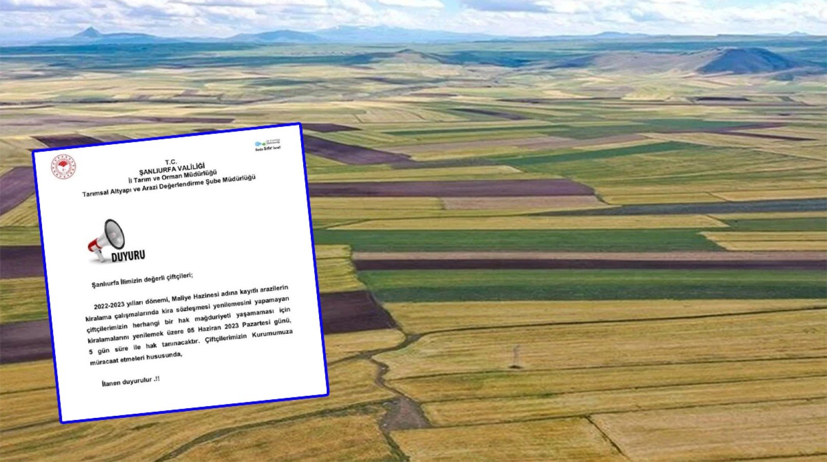 “Şanlıurfa ilimizin değerli çiftçileri, 2022-2023 yılları dönemi, Maliye Hazinesi adına kayıtlı arazilerin kiralama çalışmalarında kira sözleşmesi yenilemesini yapamayan çiftçilerimizin herhangi bir hak mağduriyeti yaşamaması için kiralamalarını yenilemek üzere 05 Haziran 2023 Pazartesi günü, 5 gün süre ile hak tanınacaktır. Çiftçilerimizin Kurumumuza müracaat etmeleri hususunda ilanen duyurulur” denildi.