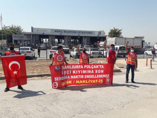Şanlıurfa'da Nakliyat-İş Sendikasına üye oldukları için TÜVTÜRK'ten çıkarıldıkları öne sürülen işçilerin eylemi sürüyor.