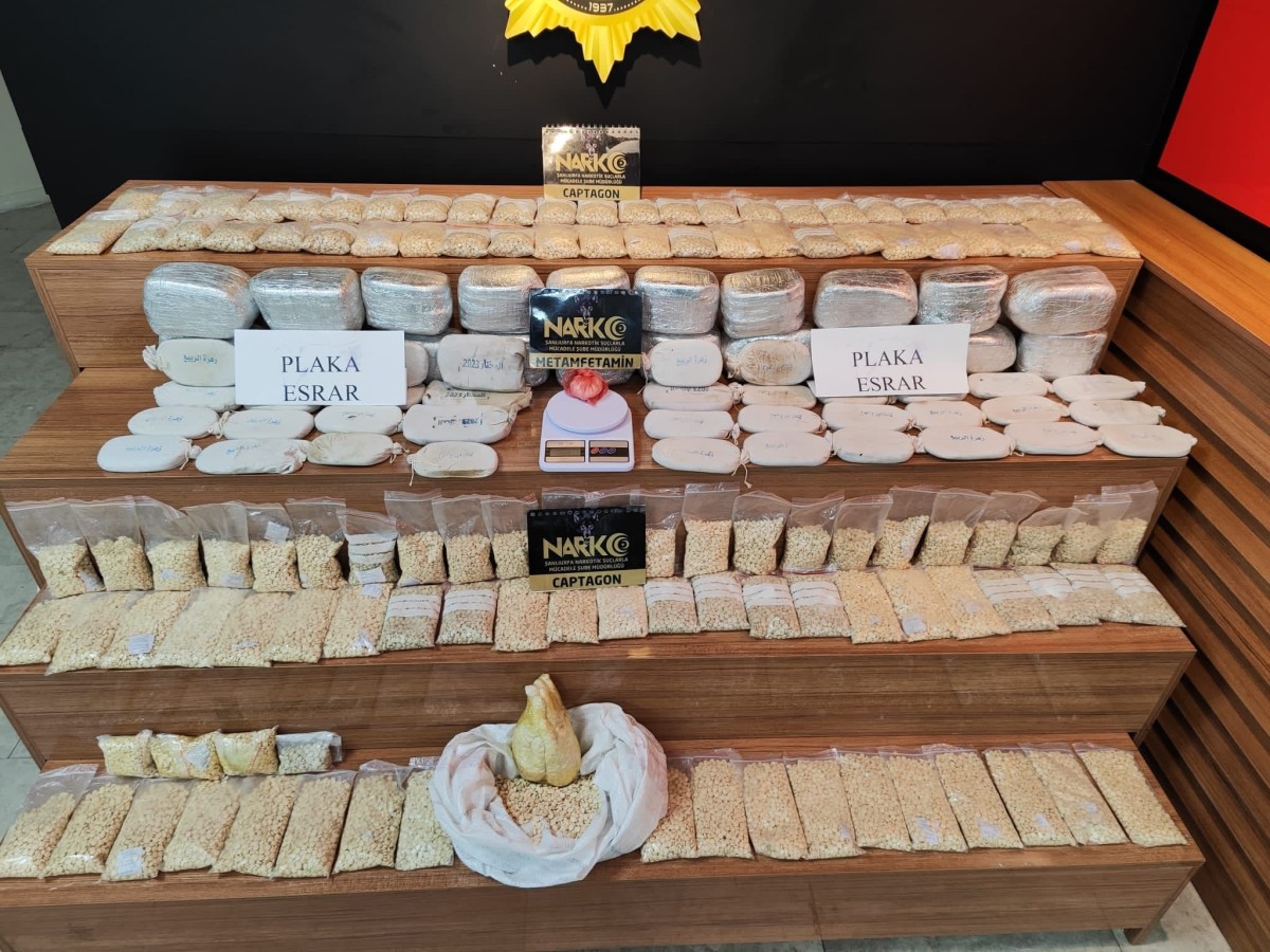 Operasyon kapsamında evde yapılan aramalarda, 139 paket halinde 29 kilo 650 gram plaka esrar, 122 bin captagon hap, 46 gram metamfetamin ve 1 hassas terazi ele geçirildi.