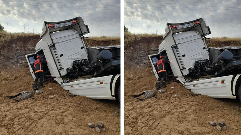 Şanlıurfa-Hilvan kara yolunda sürücüsünün direksiyon hakimiyetini kaybettiği tır, kontrolden çıkarak devrildi. Yaşanan kazada araçta sıkışan sürücü itfaiye ekiplerince kurtarıldı.
