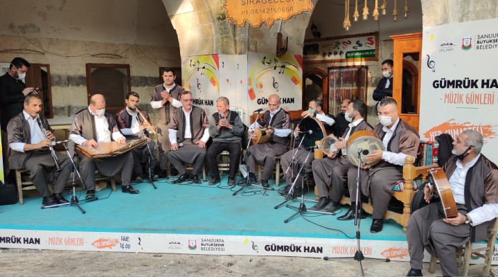 Tarihi Gümrük Han ve Barutçu Han’da düzenlenen müzik etkinliğinde Büyükşehir Belediyesi Urfa Ahengi Müzik Topluluğu, Şanlıurfa türküleri okudu.