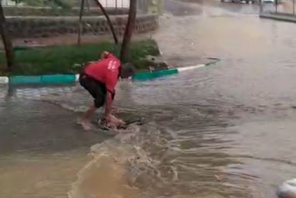 Şiddetli yağış nedeniyle rögarların tıkanmasıyla harekete geçen ise esnaf oldu. Köşe başındaki dükkanını su bastığını öne süren esnaf, rögar kapağının tıkanmasına neden olan çöpleri elleriyle toplamaya başladı.