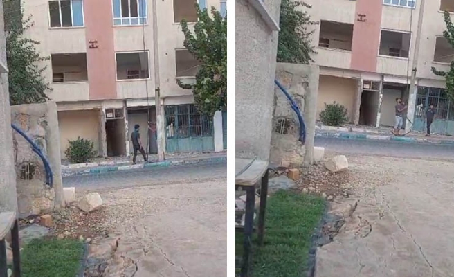 Kimliği belirlenemeyen iki kişi güpegündüz hasarlı binanın önündeki elektrik direğinden elektrik akımına aldırış etmeden binanın elektrik kablolarını keserek çaldılar.