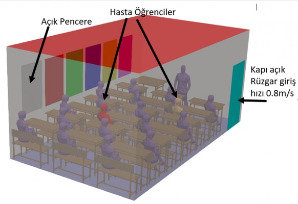 HarranCFD çalışma grubu, bir sınıfta koronavirüsün nasıl yayıldığına dair dağılım simülasyonu yaptı.
