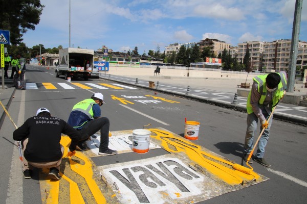 Koronavirüs tedbirleri nedeniyle sınırlanan sosyal hayatı hizmette avantaja dönüştüren Büyükşehir Belediyesi, bir yandan şehir içi ve kırsal yolların bakımını yaparken diğer yandan da yol çizgilerini ve trafik işaret boyalarını yeniliyor.