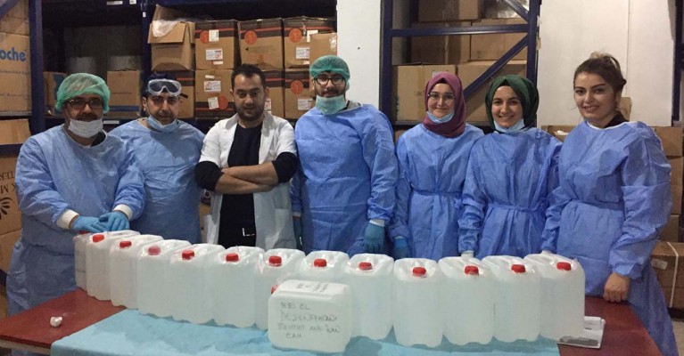 Şanlıurfa Mehmet Akif İnan Eğitim ve Araştırma Hastanesi'nde görevli 6 eczacı, hastane laboratuarında COVİD-19'a karşı el dezenfektanı üretti. Eczacıların ise şuana kadar 475 litre dezenfektan ürettiği öğrenildi.