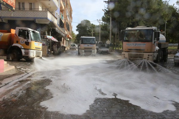 Haliliye Belediyesi, ilçe temizliği ve salgınla mücadele çerçevesinde çalışmalarına devam ediyor. Bu kapsamda Belediye Başkanı Mehmet Canpolat’ın talimatları doğrultusunda Temizlik İşleri Müdürlüğü ekipleri son olarak Ahmet Yesevi ve Selahaddin Eyyübi mahallelerinde bulunan cadde ve sokakları köpüklü su ile yıkayarak, dezenfekte etti.