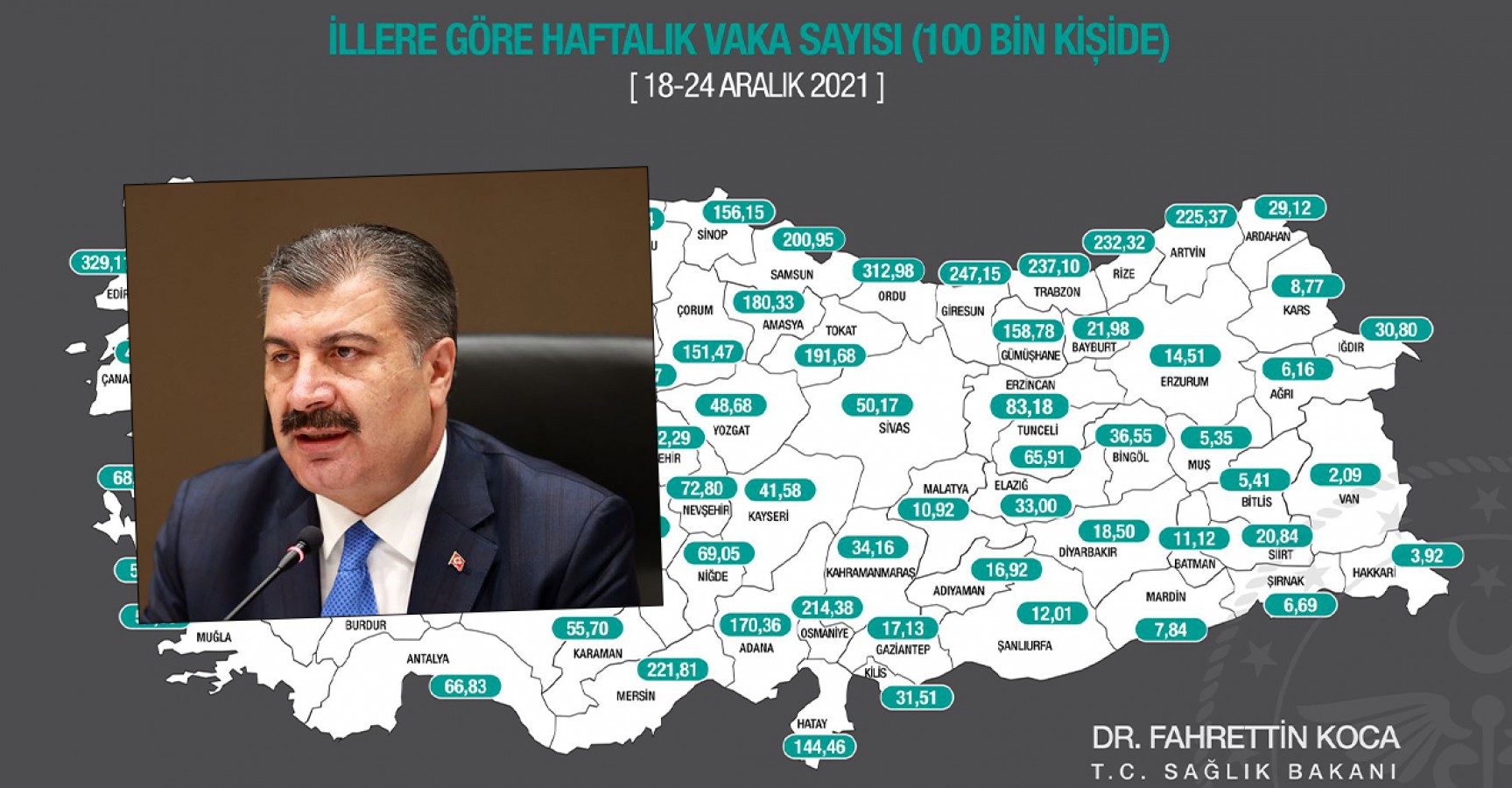 Sağlık Bakanı Fahrettin Koca, 18-24 Aralık haftasını kapsayan illere göre haftalık koronavirüs vaka sayısının haritasını yayımladı.