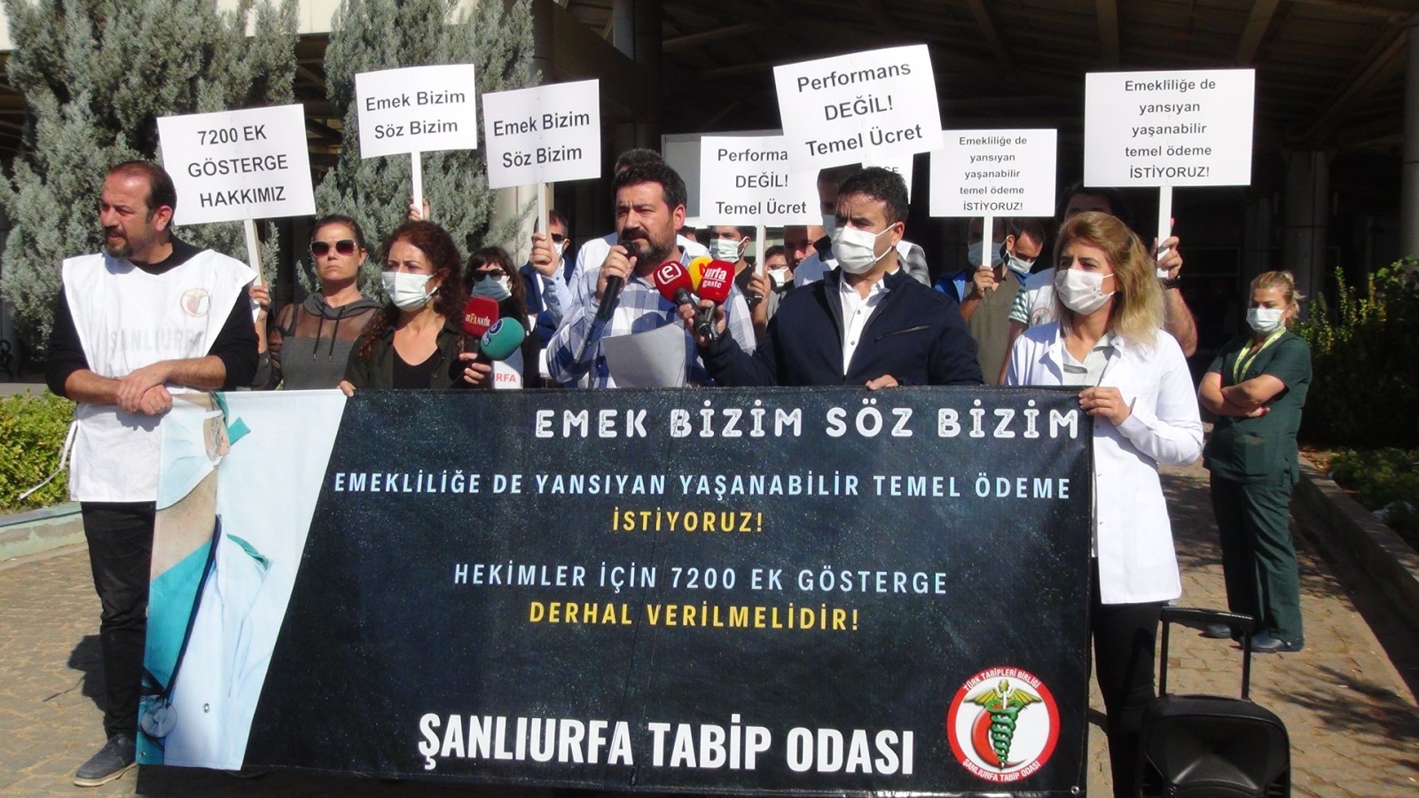 Şanlıurfa Tabip Odası üyeleri, Eyyübiye Eğitim Araştırma Hastanesi önünde bazı hekimlerle basın açıklaması yaptı. Ellerinde “Emek Bizim Söz Bizim” yazılı pankart açan oda üyeleri, “Performans Değil, Temel Ücret”, “7200 Ek Gösterge Hakkımız” şeklinde döviz taşıdı.