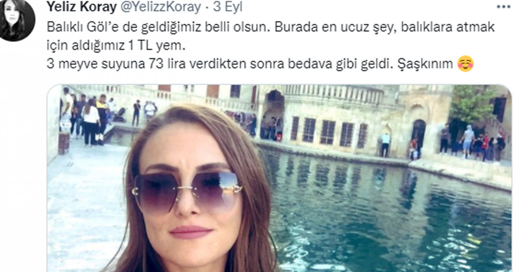 Şanlıurfa’nın tarihi ve turistik mekanlarını gezmek için kente gelen Yeliz Koray, Balıklıgöl Platosu’nda bir kafede 3 meyve suyuna 73 lira hesap çıkarılmasına isyan etti. Sosyal medyadan serzenişte bulunan Koray, “Burada en ucuz şey balık yemi” dedi.