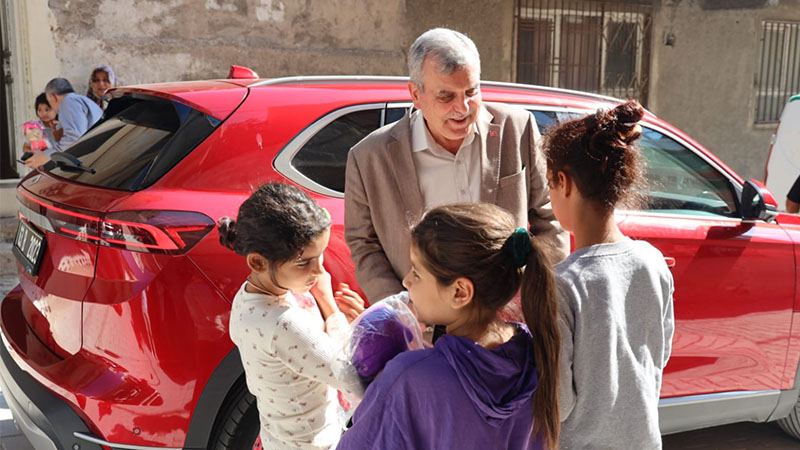 Minik bir kızın kek teklifi karşısında gülümseyen Başkan Beyazgül, bir sonraki hafta sonu küçük kızın evine misafir olacağının sözünü verdi. Küçük çocuklarla yakından ilgilenen Başkan Beyazgül, çocuklara oyuncak hediye etti.
