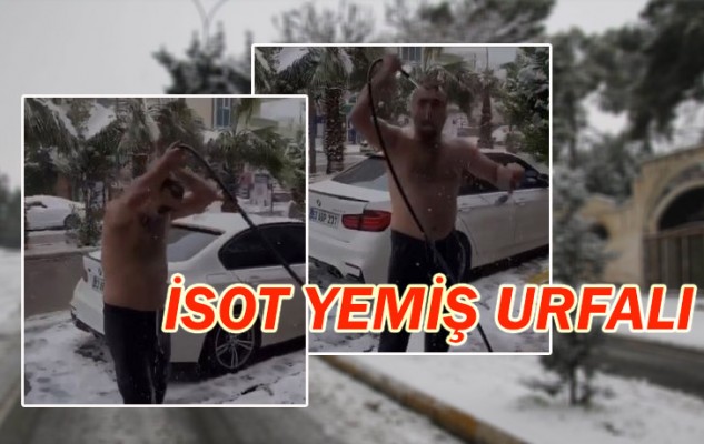 Şanlıurfa’da bir vatandaş kar yağışına meydan okurcasına hortumla yıkandı. O anlar ölümsüzleştirilirken, izleyenler "İsot yemiş olmalı" yorumunda bulundu.