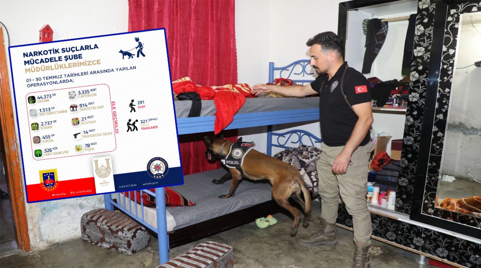 Narkotik ekiplerinin temmuz ayında yaptığı çalışmalarda 44 bin 373 gram kimyasal uyuşturucu (skunk), bin 513 gram metamfetamin, 2 bin 737 gram esrar, 455 gram eroin, 326 kök Hint keneviri, 3 bin 335 Captagon hap, 914 sentetik hap, 21 Ecstasy hap, 14 ruhsatsız silah ve 78 fişek ele geçirildi.