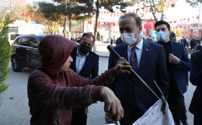 Sokaktan hurda ve kağıt toplayarak ailesinin geçimine katkıda bulunmaya çalışan bir çocukla sohbet eden Vali Erin, babasının hasta olduğunu ve kendisinin de okula gitmeyerek iki yıldır sokaklarda çalıştığını belirten çocukla ilgilenilmesi için talimat verdi.