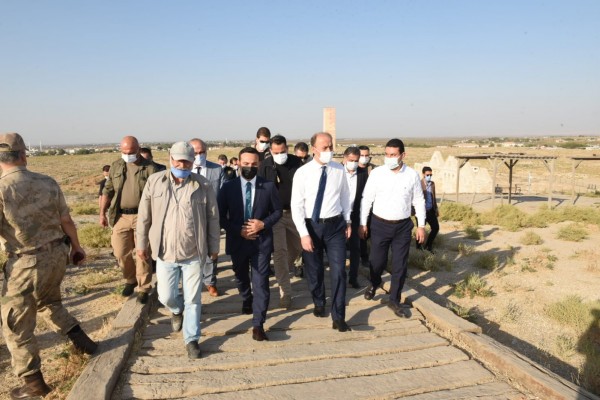 Harran Kaymakamı Cihat Koç, İl Jandarma Komutanı Tuğgeneral Metin Düz, İl Emniyet Müdürü Selçuk Doğuş ve Harran Belediye Başkanı Mahmut Özyavuz ile birlikte Harran ören yerine geçen Vali Erin, burada devam eden restorasyon ve kazı çalışmaları hakkında Prof. Dr. Mehmet Önal’dan bilgi aldı.