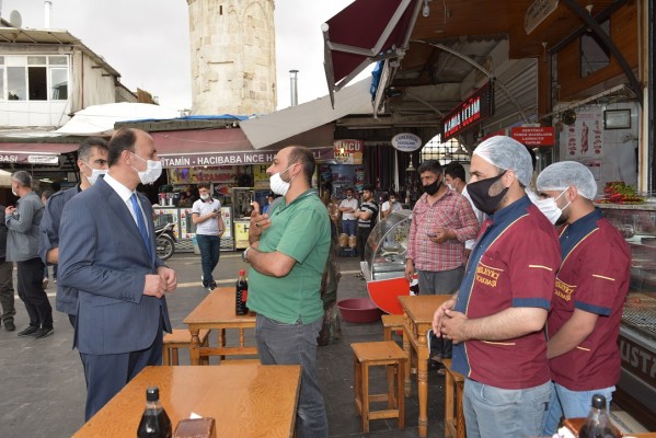 Şanlıurfa’nın en işlek çarşılarından Haşimiye ve Ticaret Borsasını ziyaret eden Vali Erin, yeniden faaliyete başlayan işyerlerinde esnaf ve vatandaşlara uyarılarda bulundu.
