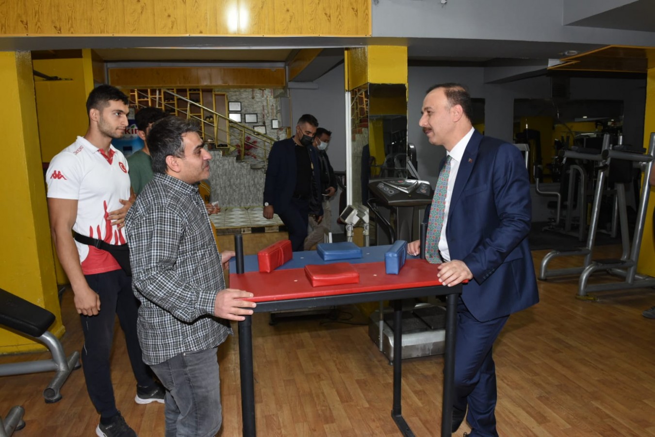Şanlıurfa Büyükşehir Belediyesi spor tesislerinde bilek güreşi antrenmanlarına devam eden sporcuları ziyaret ederek, milli takım antrenörü Şehmus Gültekin ve genç sporcularla sohbet eden Vali Erin, başarılarından dolayı gençleri tebrik etti.