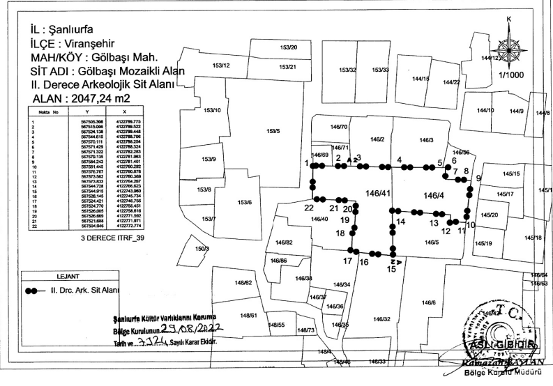 Yayımlanan karara göre, Viranşehir ilçesine bağlı Gölbaşı Mahallesi içerisinde, özel mülkiyete ait, 146 ada 4 ve 41 nolu parselde yer alan Gölbaşı mozaikli alanın korunması gerekli taşınmaz kültür varlığı özelliği göstermesi ve sosyal yaşamın devamlılığı ilkesi nedeni ile 2. derece arkeolojik sit alanı ilan edildi.