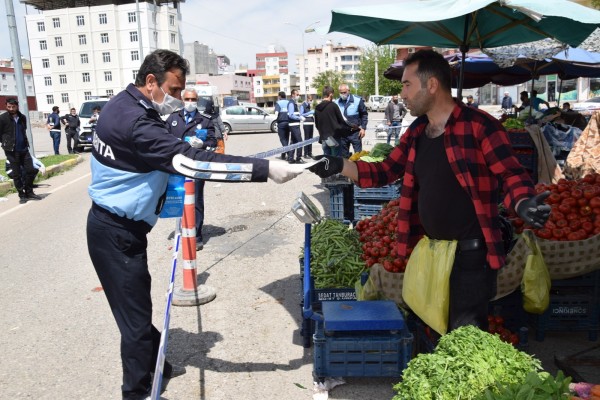 Yapılan denetimle birlikte pazarcı esnafı ve pazara alışveriş için gelen müşterilere de maske dağıtıldı.