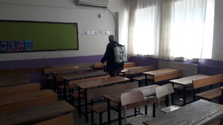 Belediye ekipleri, sabah saatlerinde ilçe genelinde sınav yapılacak okullarda, ortak kullanım alanı ve dersliklerde dezenfeksiyon çalışması yaparak, hijyenik hale getirdi. Viranşehir Belediyesi Sağlık İşleri Müdürlüğü ekipleri, korona virüs tedbirleri kapsamında insan sağlığını etkilemeyen alkollü dezenfektanlarla öğrencilerin ve sınav yetkililerinin temas edecekleri sıralar, kapı kolları, masa ve sandalyeler, koridorlar ve lavabolar dezenfeksiyon işlemleri tamamlandı.