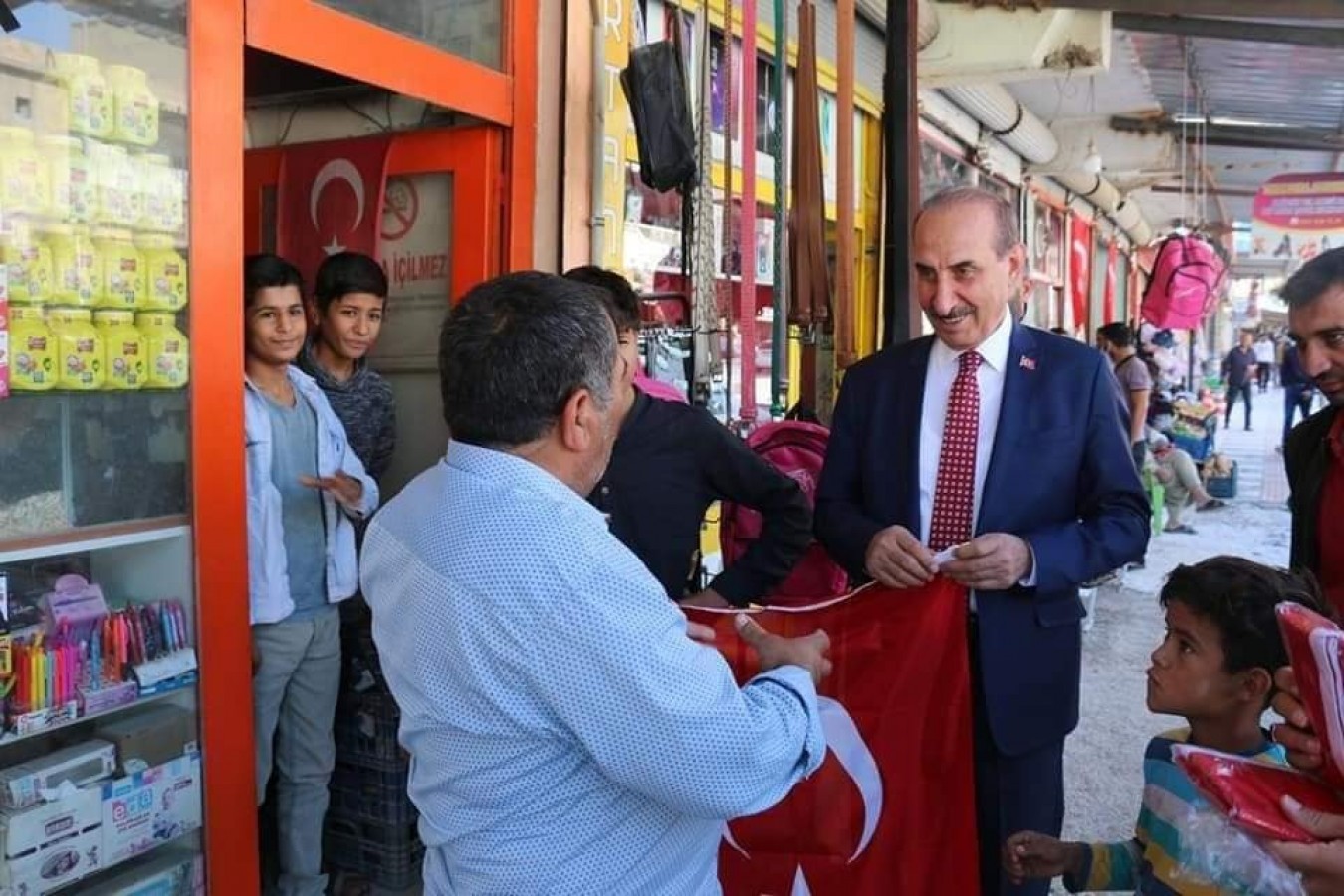 Akçakale Belediye Başkanı Mehmet Yalçınkaya, Barış Pınarı Harekatı’nın 2’nci yıl dönümünde esnafa Türk bayrağı dağıttı.