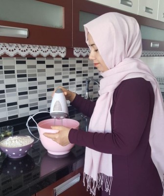 “Önceden örgü örüyordum aile ekonomisine destek olmak için ama çocuklar da okula başlayınca eve daha çok katkıda bulunmak için ne yapabilirim diye düşündüm. Çocuklar küçük olduğu için işe de gidemezdim, zaten Ceylanpınar’da kadına yönelik iş imkânı yok denilecek kadar az. Kızım küçük, onu kreşe versem aldığımı oraya vermek zorunda kalacaktım. Onun için hem çocuklarımın yanında kalmak için, hem ev işlerimi yapmak için hem de eşime destek olmak için böyle bir şey düşündüm. Eşimin borçları da var, maaşı da düşüktü. Akrabalar falan yaptığım pastaları görünce ısrar ettiler. Sipariş yap, pastaneden alınca yenilmiyor dışarıdakiler çok bayat falan dediler. İlk pastamı yaptığımda sipariş almaya başladım dediğimde istekler artmaya başladı, ben de öyle başladım.“