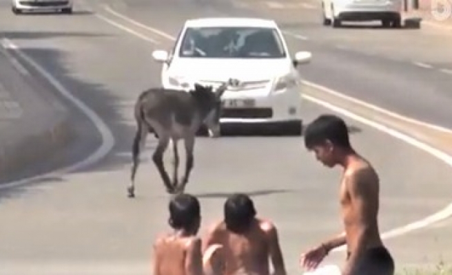 ortasında kalan eşeğe çarpmamak için dikkatli olan sürücülerin hassasiyeti